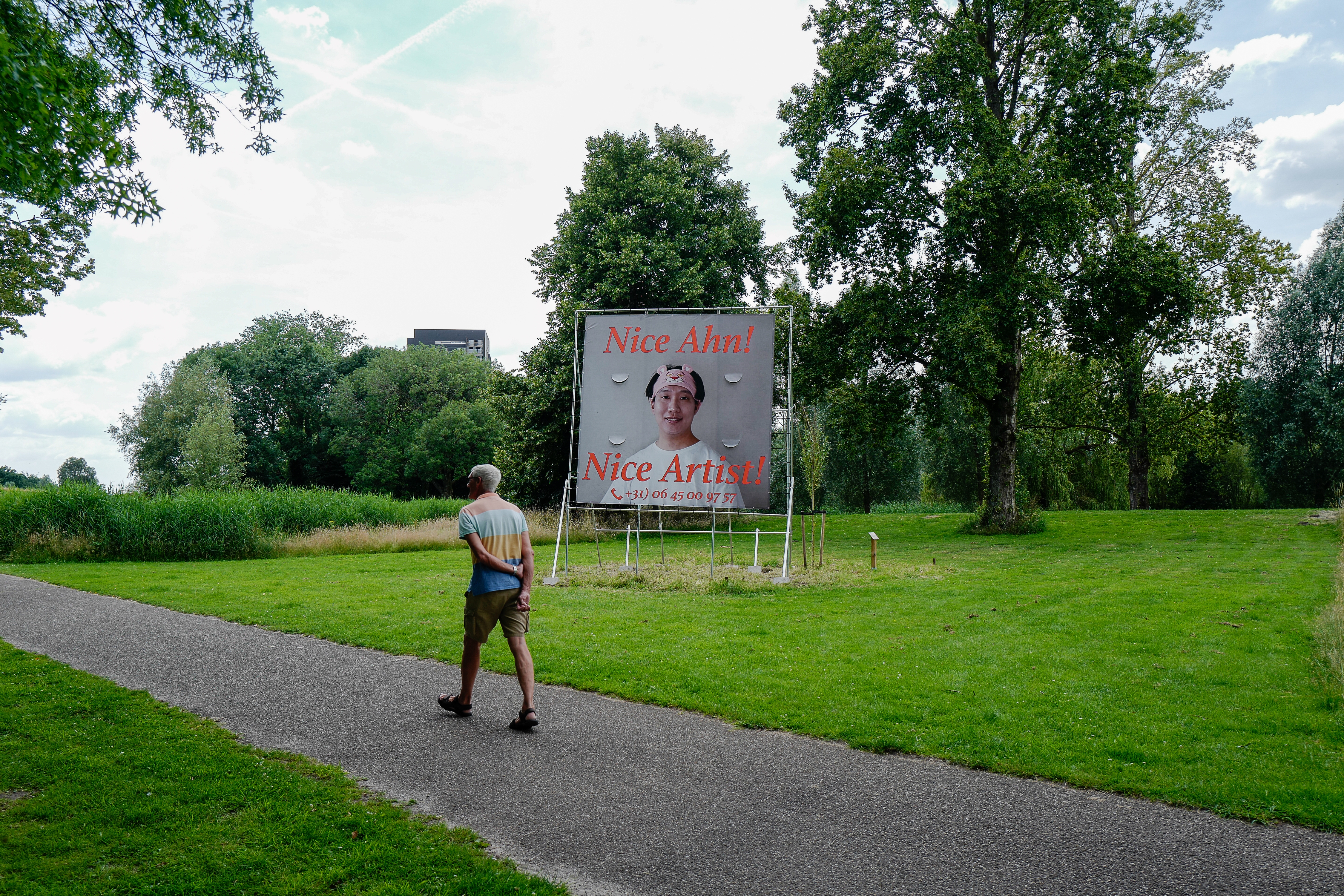 It is not a coincidence to encounter Ahn's work for the first time not in a gallery but on a social platform. It was an image of a large billboard in a serene park in Breda, surrounded by trees. The billboard displayed the face of an East Asian man wearing a Pink Panther headband, alongside the bold slogan 'Nice Ahn, Nice Artist!' and contact information. This conspicuous billboard, disrupting the park's tranquility, instantly captivated passersby. Various reactions poured in via the provided phone number, ranging from requests for removal due to its unsettling nature to messages of support for the artist and curious inquiries. The person on the billboard was none other than the artist himself. The post aroused curiosity of the artist, intrigued by this bold self-promotion and the buzz it generated.