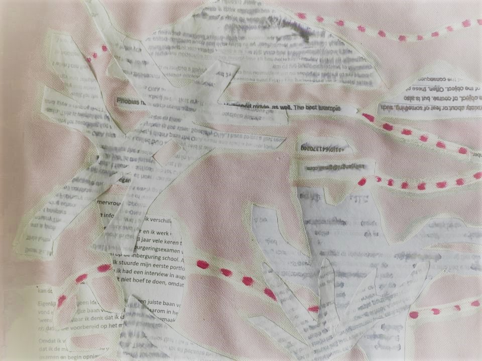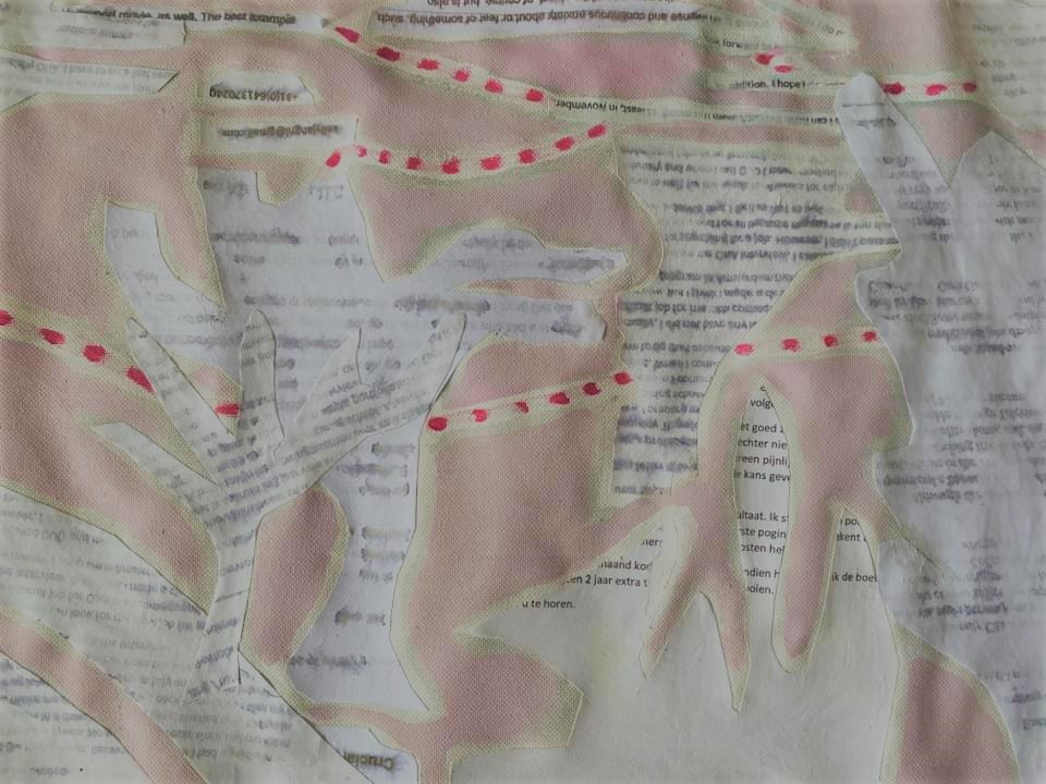 <The Other-land> is my view towards the Netherlands. It's also the way I look at myself in this place. This work is done through a collage process on the canvas after working with a brush on the backside of the paper on which the text was printed. It is expressed as if the objects all look similar and appear to be mixed, but the boundaries exist clearly among them. The boundaries may be formed by others or may be by myself. In addition, the use of the backside of the printed paper represents the backside of another world visually, the matter of legibility, and another attempt (e.g., act of soaking with water) to reveal the text on the backside.
